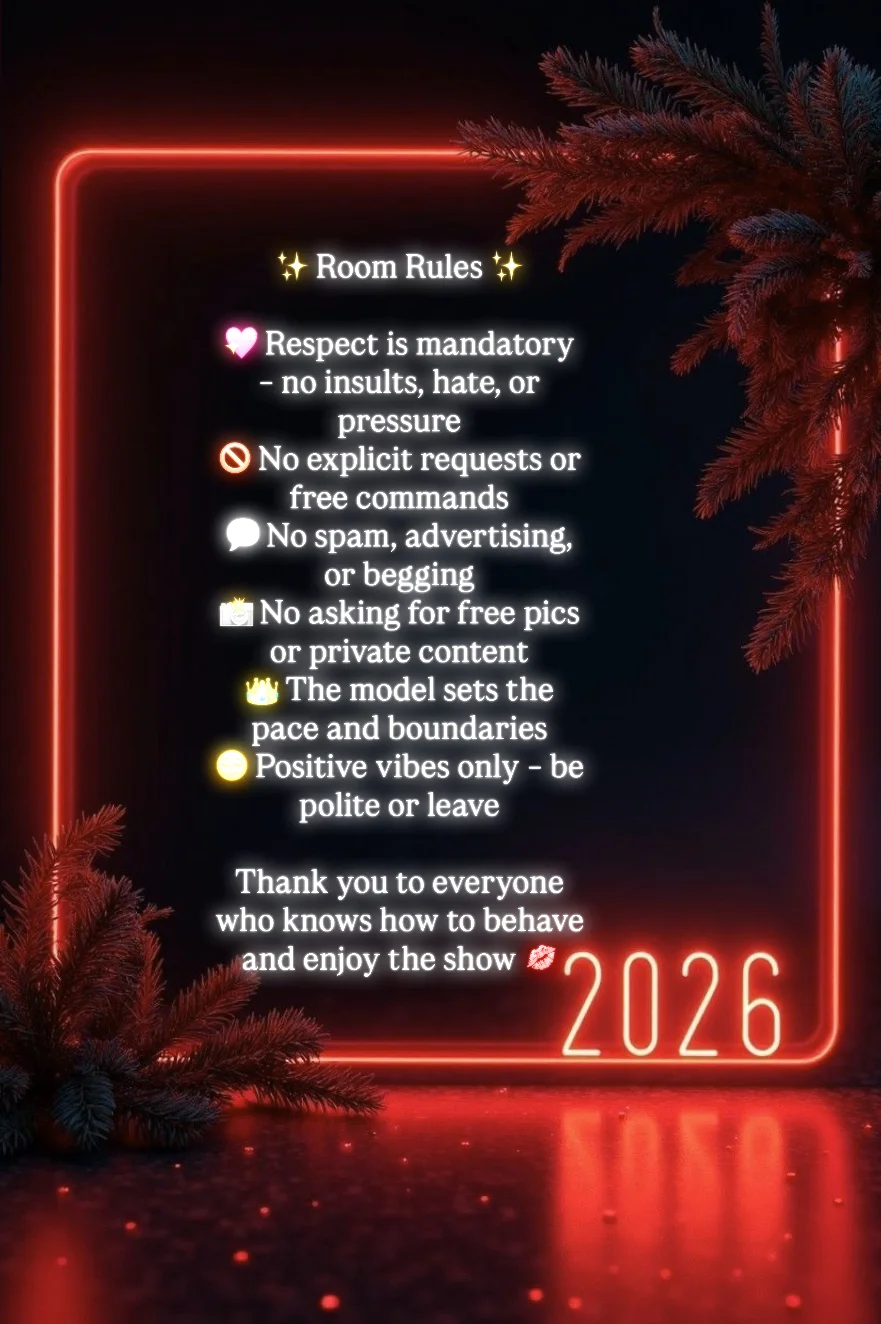 ✨ Regulile camerei ✨ 💖 Respect obligatoriu – fără jigniri, hate sau presiuni 🚫 Fără cereri explicite sau comenzi gratuite 💬 Fără spam, reclame sau cerșit 📸 Fără cereri de poze/video private gratuite 👑 Modelul stabilește ritmul și limitele 😌 Vibe pozitiv only – fii politicos sau ieși din cameră Mulțumesc celor care știu să se comporte și să se bucure de show 💋